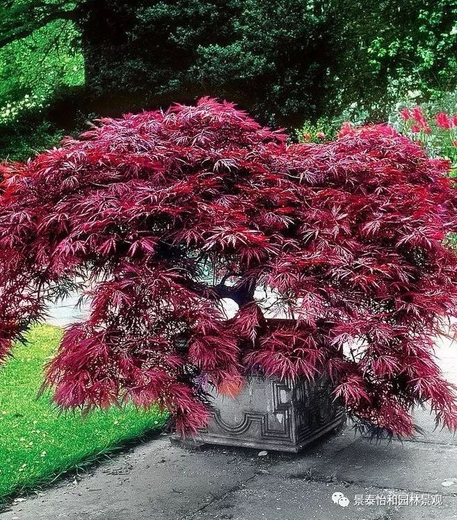 形態特征:落葉小喬木。樹姿開張,小枝細長。樹皮光滑,呈灰褐色。單葉交互對生,常叢生于枝頂。葉掌狀深裂,裂片5-9.裂深至葉基,裂片長卵形或披針形,葉緣銳鋸齒。春、秋季葉紅色,夏季葉紫紅色。嫩葉紅色,老葉終年紫紅色。